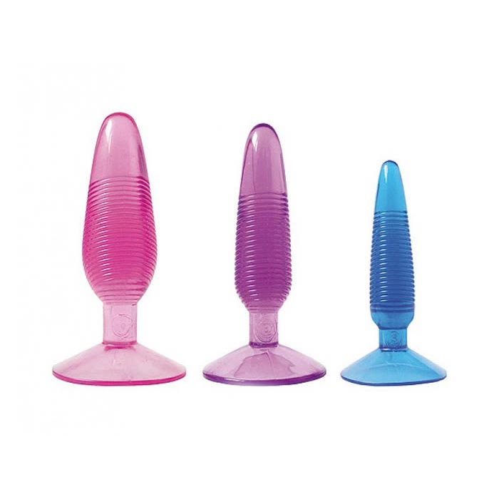 Set di coloratissimi butt plug composto da 3 pezzi, tutti con leggera scanalatura.