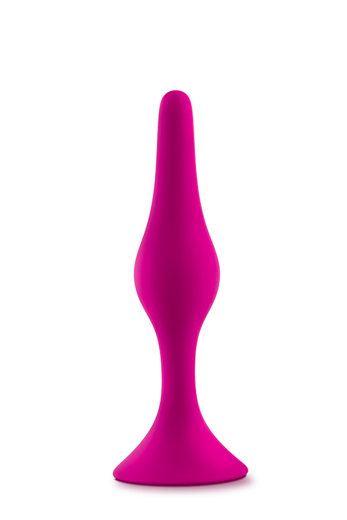 Soft tapered head and slim shaft are comfortably and easily inserted. Satin smooth silicone feels amazing. Suction cup base anchors Plug safely outside the body.