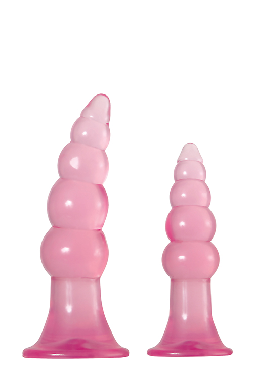 Stimulating butt plug set. Tapered tip for easy penetration. Small bulbs at the tip. Bulbs gradually grow larger. Suction-cup base for hand-free. Soft and flexible PVC.