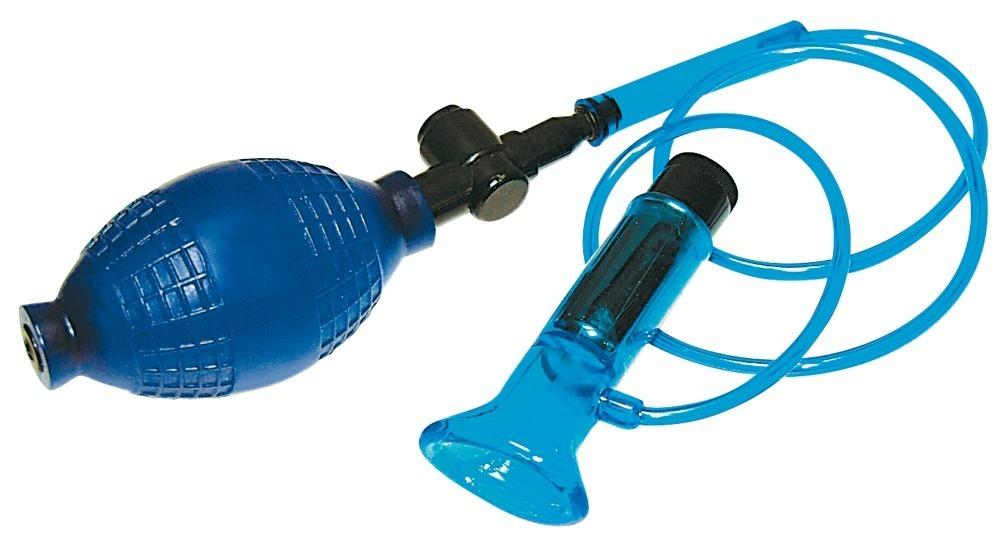 Succhiatore di clitoride e capezzoli vibrante (ca. 8,5 cm di lunghezza, apertura aspirante 1,5 x 3 cm) attaccato al tubo flessibile lungo 60 cm con pompa. Blu. Materiale: PVC, ABS. Incluse batterie.