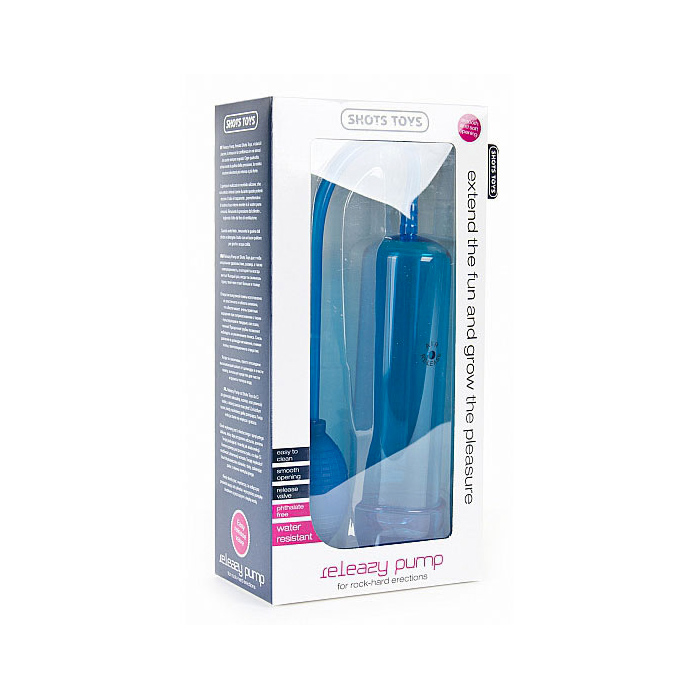 Releazy Pump, firmata Shots Toys, vi dará il piacere, la misura e la confidenza in voi stessi che avete sempre sognato! Ogni qualvolta schiaccerete la pallina della pressione, la vostra erezione diventerá piú intensa e piú forte. L’apertura é realizzata in morbido silicone, che non urterá o irriterá il pene durante queste potenti erezioni. Il tubo é trasparente, permettendovi di vedere al suo interno mentre lo il vostro pene crescerá. Rimuovete la pressione dal cilindro, togliendo il dito dal foro di ventilazione. Quando avete finito, rimuovete la guaina dal cilindro e detergete il tutto con un buon pulitore per giochi e acqua calda.