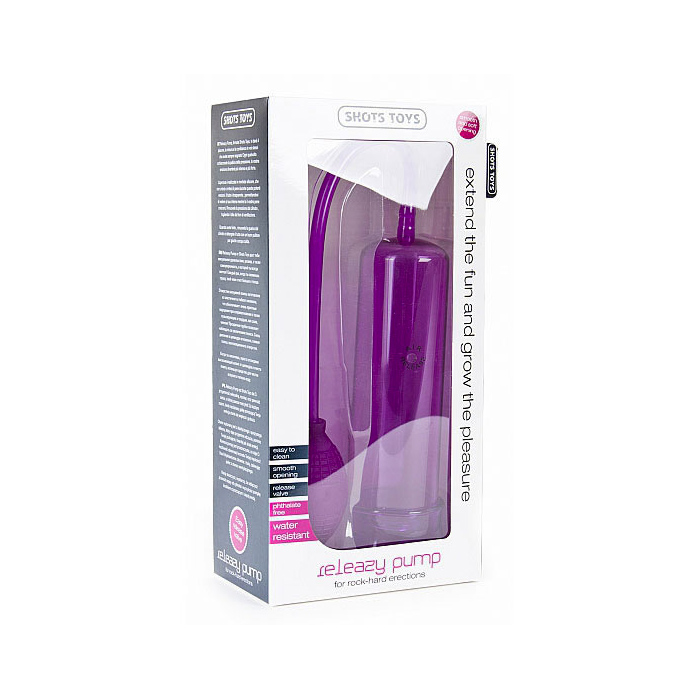 Releazy Pump, firmata Shots Toys, vi dará il piacere, la misura e la confidenza in voi stessi che avete sempre sognato! Ogni qualvolta schiaccerete la pallina della pressione, la vostra erezione diventerá piú intensa e piú forte. L’apertura é realizzata in morbido silicone, che non urterá o irriterá il pene durante queste potenti erezioni. Il tubo é trasparente , permettendovi di vedere al suo interno mentre lo il vostro pene crescerá. Rimuovete la pressione dal cilindro, togliendo il dito dal foro di ventilazione. Quando avete finito, rimuovete la guaina dal cilindro e detergete il tutto con un buon pulitore per giochi e acqua calda.