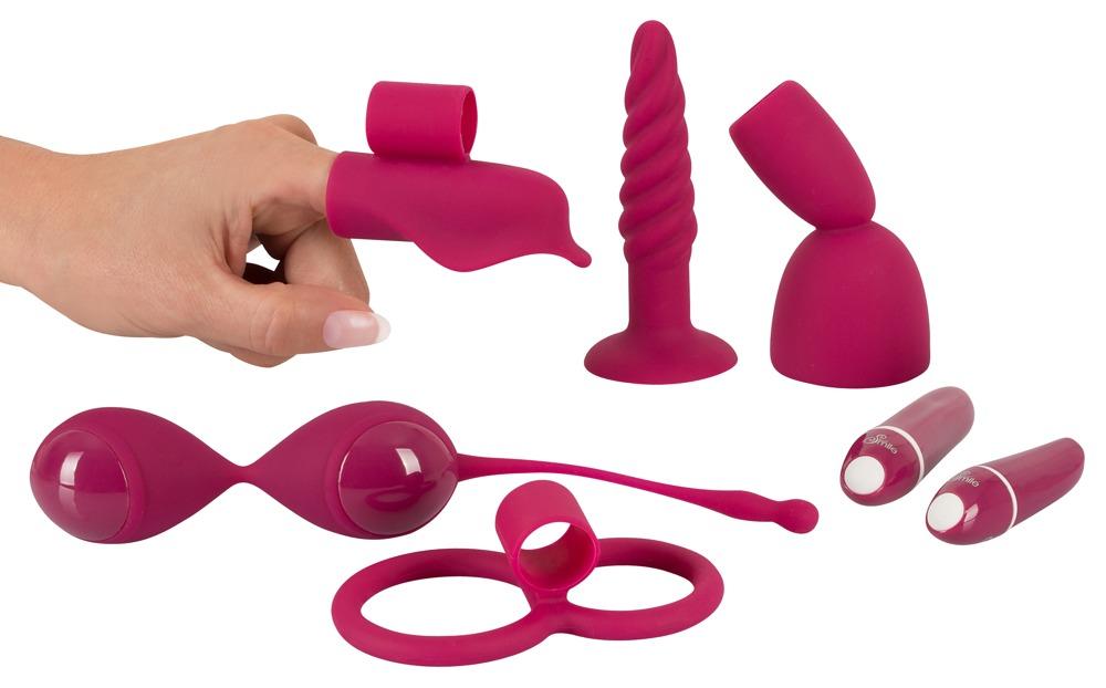The perfect starter set for curious couples!7-piece toy set with 2 different sized mini vibrators that each have 7 vibration modes. The cock and ball ring, the glans vibrator and the finger vibrator each have a loop for the two mini vibrators to experience this arousing set in all its glory. The butt plug has an exhilarating texture and can be attached to any smooth surface with its suction cup for hands-free fun. The included love balls can be used for an erotic foreplay session or as a training device for the pelvic floor muscles. A strengthened pelvic floor lets HER firmly surround the penis during sexual intercourse and have stronger orgasms while also counteracting urinary incontinence. All toys included in this set have a pleasantly soft silicone surface that feels soft to the touch. Batteries are included (3 x LR44 and 1 x N).Love balls complete length 20.5 cm, Ø 3.7 cm, weight 80 g. Cock and ball ring complete length 9.5 cm, ball ring Ø 4 cm, cock ring Ø 3.5 cm. Butt plug complete length 11 cm, insertion depth 10 cm, Ø max. 2.5 cm. Glans vibrator complete length 10 cm, insertion depth 4 cm, Ø 4 cm. Mini vibrator 1 complete length 6.8 cm, Ø max. 2.1 cm. Mini vibrator 2 complete length 8.6 cm, Ø max. 2.1 cm. Finger vibrator complete length 7.5 cm. Silicone with a PU coating, ABS.