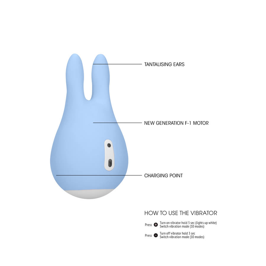 Questo massaggiatore stimolatore clitorideo ricaricabile dalla forma unica è ideato per avere il massimo della soddisfazione! Le orgasmiche orecchie di questo mini massaggiatore clitorideo a coniglio sono graziose ma dinamiche, sono il giocattolo clitorideo perfetto per il gioco da soli o in coppia. Questo giocattolo è perfetto per il palmo della tua mano e le 2 punte arrotondate ed uguali vibrano e si muovono a 7.500 RPM. Presenta 10 funzioni di vibrazione c, è resistente all’acqua, estremamente silenzioso a solo 60dB, comprende una batteria ricaricabile che può essere totalmente ricaricata tramite il cavo USB in soli 120 minuti e ti fornirà 100 minuti di passione. Il prodotto è realizzato al 100% in silicone di grado medico super morbido e comprende una base in ABS termoplastico privo di ftalati e un tasto di accensione.
