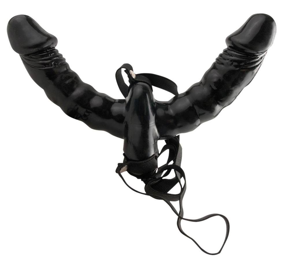 Il duo del piacere per il doppio del piacere!Elastico nero, regolabile, con due vibratori a forma di pene scanalati neri. Entrambi i vibratori sono regolabili separatamente e in continuo tramite telecomando. Dimensioni del vibratore lungo 15 cm ciascuno, Ø 4 cm. Materiale: PVC. Compresa la maschera per gli occhi (100% poliammide). (Le batterie sono da ordinare separatamente: 4 x Mignon/AA).