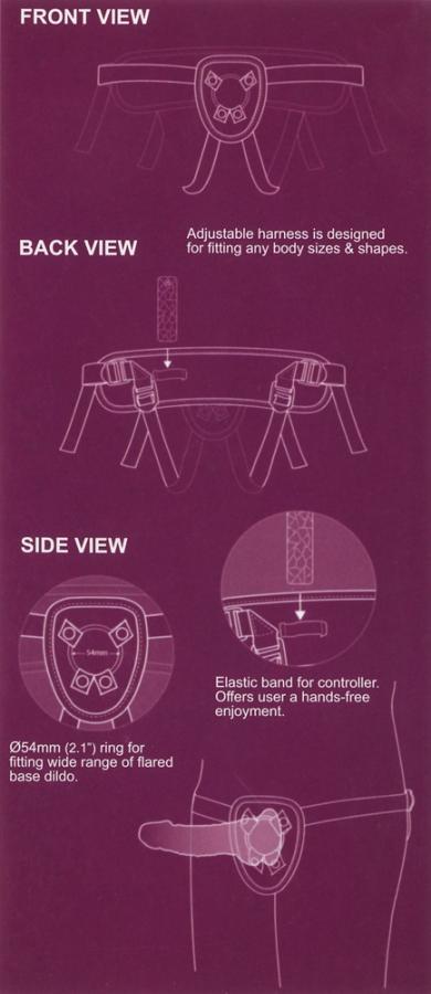 For hot role play and more! HIM and HER or HER and HER – you will definitely spice up your love life with this hot penis-shaped strap-on vibrator, no matter what the combination. The harness is made out of black faux leather and is adjustable so that it fits perfectly. There is a metal ring at the front for attaching the main attraction to the harness. This skin-coloured vibrator has a straight, pleasure-giving shaft with veins on it, and it can’t wait to fill you up. The realistic-looking pink glans and slight testicles add the perfect finishing touch to the natural-looking vibrator. The vibrator’s suction cup is great for keeping it in place on the harness once it goes through the metal ring. However, it’s also good at sticking to smooth flat surfaces because this vibrator can be used on its own as well. And how do you get it to vibrate? You can use the remote control on a wire to control the 10 different vibration modes – you will definitely find a perfect mode to suit your needs. The harness has a loop at either side and you can put the black remote control into one of them so that your hands are free for other things. So what are you waiting for?! Vibrator: complete length 19 cm, insertion depth 14 cm, Ø 3.7 cm. Harness 63 cm x 132 cm (adjustable). Ring Ø 5.4 cm. Please order batteries separately: 3x AAA/Micro. PVC (vibrator), PU & iron (harness), ABS (remote control).