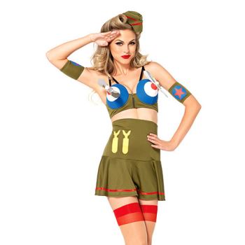 ABITO SEXY MILITARE ANNI 50. Costume sexy da ragazza dell'esercito con top, una minigonna a vita alta, due bracciali per le braccia e un cappello abbinato. Il costume veste stretto, consigliabile una taglia in piu'.