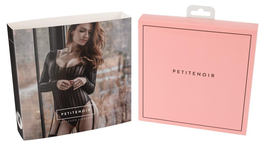 Erotic body!The tight-fitting body is completely made out of soft, elastic stripe material. With long sleeves and hook and loop fastener in the crotch area. Round neckline at the front and back. On each side are 3 elastic suspender straps that are adjustable and completely removable. 70% polyamide, 30% elastane. Please note: There is a separate size chart for Petitenoir.