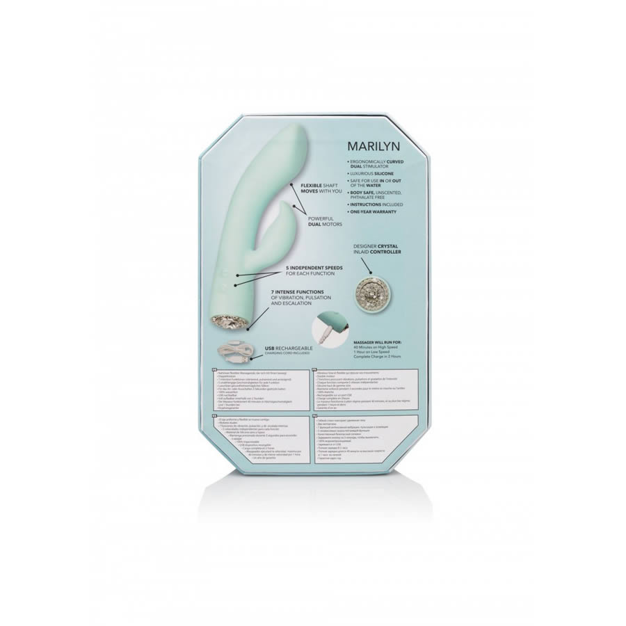The marvelous Pavé Marilyn is a dual motor rabbit massager with dazzling crystal adornments, flexible body and 35 sensational vibration settings for a truly one-of-a-kind pleasure experience. The contoured teaser tip and sensual shaft are perfect for caressing internal and external sweet spots. For an ultra-smooth surface and flexible body, the curved stimulator and massager are covered in a premium Satin Finish Silicone. This silky-smooth vibrator is packed with 7 functions of vibration and 5 independent speeds for each function for stimulation made just for you. The easy-touch control buttons let you effortlessly flicker through each function of vibration, while increasing or decreasing the function intensity. Whether you’re taking a dip with a lover or indulging in a steamy solo session, look forward to up to 2 hours of waterproof vibration. Recharge pleasure and get back to playtime in only 2 hours with the provided USB cable. The hypoallergenic luxury teaser is made from Satin Finish silicone with glass crystal adornments.