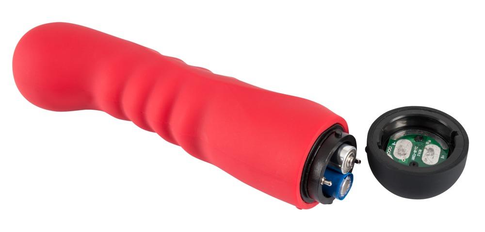 Looking for something new?This red vibrator stands out because of its unusual shape. It has a slightly curved, bulging tip and a grooved shaft, which will feel amazing when you’re inserting it. This lover has a total of 10 different vibration modes that are just waiting for you to try them out. All you have to do is press the button for approx. 5 seconds and the vibrator will start vibrating. The next orgasm will be just around the corner!Complete length 16.5 cm, insertion depth 14 cm, Ø 3-3.8 cm. Material: Silicone with PU coating. Please order batteries separately: 2 x Micro/AAA.