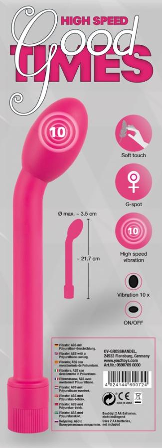 Spot on G-spot stimulation! It really is worth stimulating this female pleasure spot for brilliant orgasms – you can easily reach your G-spot with this pink vibrator. The curved, egg-shaped tip on the straight shaft is the perfect shape for pleasuring this erogenous zone. The 10 powerful vibration modes provide additional stimulation and there is a vibration for every situation. The vibrations are controlled at the push of a button.Complete length 21.7 cm, insertion depth 18.2 cm, Ø 1.9-3.5 cm. Material: ABS with a polyurethane coating. Please order batteries separately: 2 x Mignon/AA.