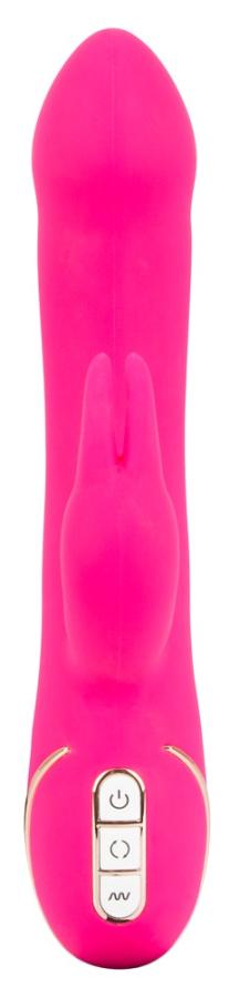 Rechargeable, waterproof pink vibrator with silver-coloured parts for decoration. With a round G-spot tip with rotation and vibration functions. The functions have three speeds and intensities. It also has a rabbit-shaped clitoris stimulator with nose and movable ears. The clitoris stimulator has 7 vibration patterns. It feels extremely realistic, thanks to the silicone. Rechargeable using the included USB cable. (Charging time 2.5 hours). 22 cm long, insertion depth 12 cm, Ø 3.1 to 3.8 cm. Clit tickler 7 x 2.4 cm. Material: silicone, ABS, phthalate-free according to EU Regulation REACH.