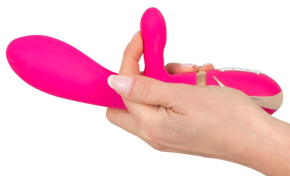 Double-layered vibrator with a soft surface, 7 vibration modes and 7 modes for the clit tickler. Complete length 22 cm, Ø 2.4–3.5 cm. The functions can be controlled separately with the buttons. Waterproof. Material: soft touch silicone, ABS, PU.Includes a USB cable and instruction manual.
