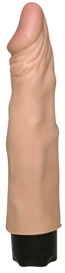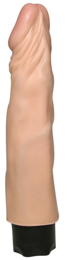 Vibratore a forma di pene color pelle. 22 cm di lunghezza, Ø 4-4,5 cm. Materiale: PVC.