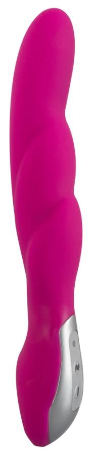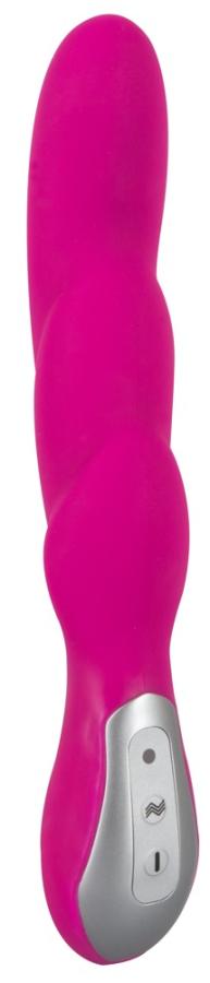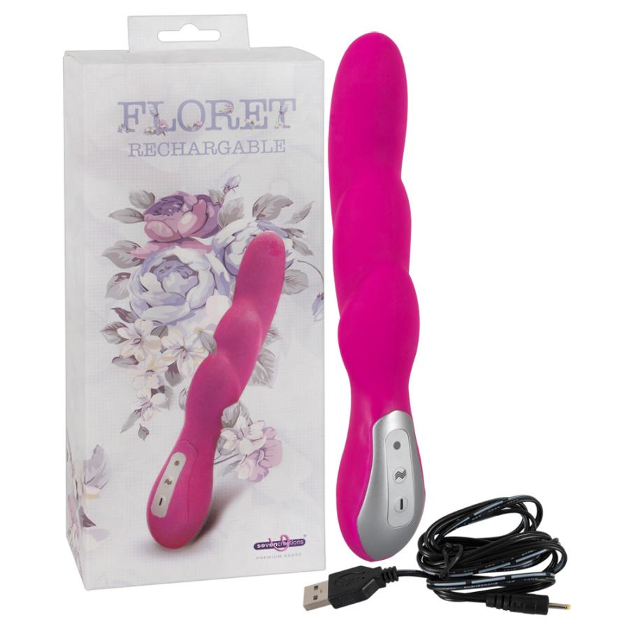 Rechargeable silicone vibrator with enclosed USB-wire. 7 vibration rhythms are displayed by differently colored LEDs. Total length approx. 20 cm, insertable depth 13.5 cm, ø 2-3 cm. Material: silicone, ABS (controller).