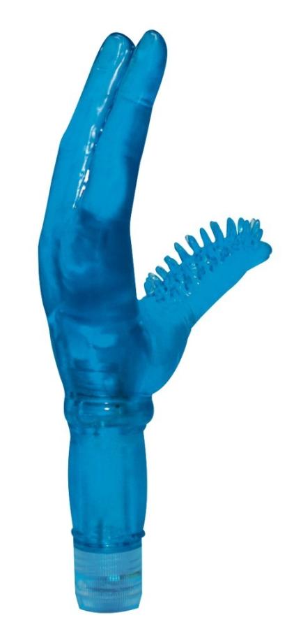 Vibratore a 2 dita per il piacere vaginale e clitoriale. Blu. 23 cm di lunghezza, Ø dito 4 cm. A regolazione continua. Materiale: PVC.