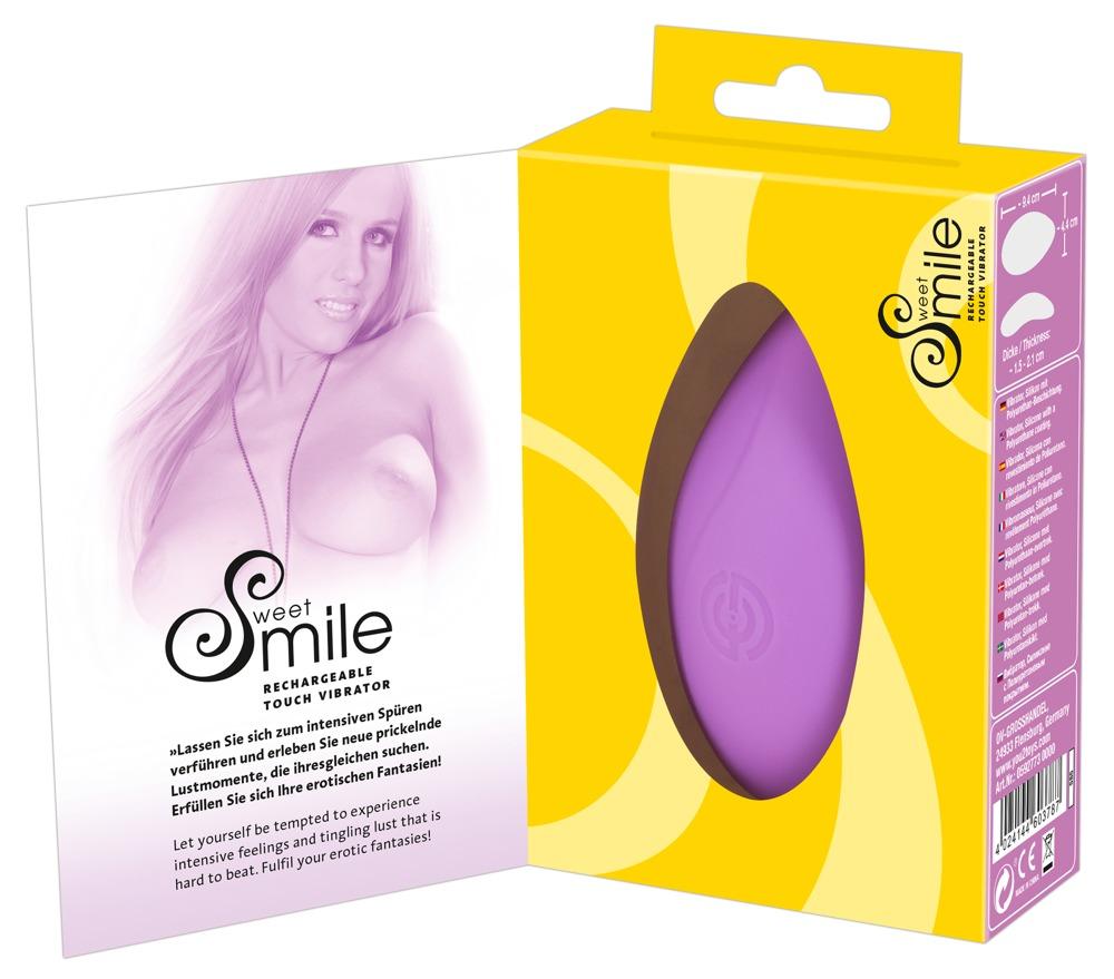 Small, cheeky and very discreet!The extremely flat Sweet Smile lay-on vibrator is perfectly adapted to the shape of the body and also very easy to hold because of its ergonomic design. The smart pleasure-giver is also very satisfying in terms of material: it is made out of high-quality silicone with a PU coating that makes it extremely soft and skin-friendly. Its flat design means that the lay-on vibrator can also be placed inside panties very discreetly. It has 10 exciting vibration modes to cover the full spectrum of intimate fun.9.4 cm long, 4.4 cm wide, only max. 2.1 cm high.Silicone with a PU coating.The vibrator comes with a USB charging cable.Battery run time and charging time: approx. 60 minutes.