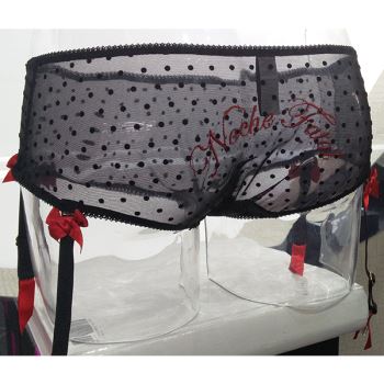 COULOTTE NERA A POIS: Coulotte nera velara a pois con gancetti removibili e sfiziosa scritta in rilievo di colore rosso